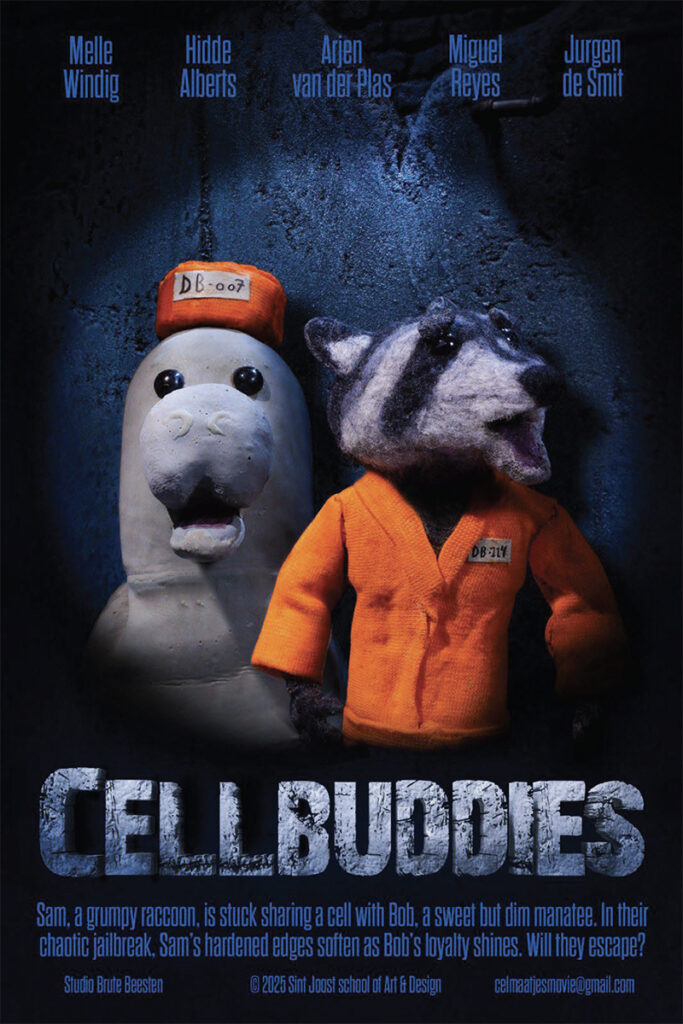 Korte stop‑motion film Cell Buddies (originele titel Cel Maatjes) is een vijf minuten durend handgemaakt verhaal over twee onverwachte celgenoten: Sam, een norse wasbeer, en Bob, een zachtaardige maar wat naïeve zeekoe. Wat begint als een simpelontsnappingsplan, groeit uit tot een hartverwarmend verhaal over verbinding, elkaar helpen en vriendschap. Juist in deze onzekere tijden, waarin de wereld soms beangstigend voelt, spreekt de boodschap van elkaar steunen sterk tot de verbeelding en laat het publiek opgelucht en geïnspireerd achter.