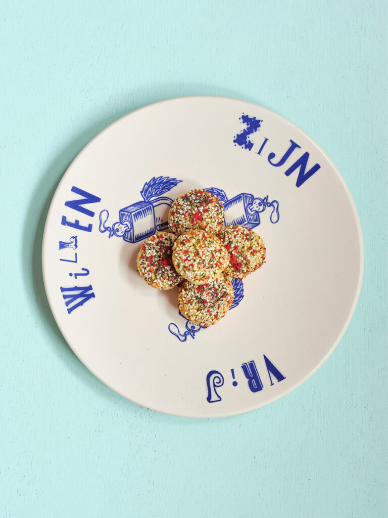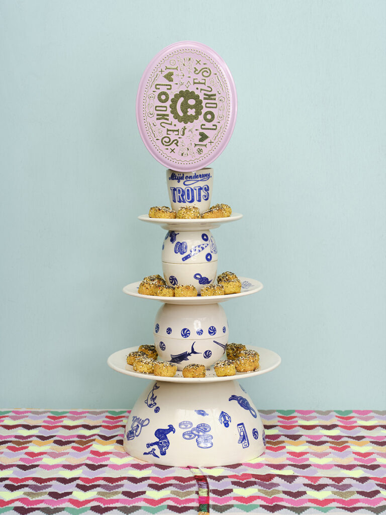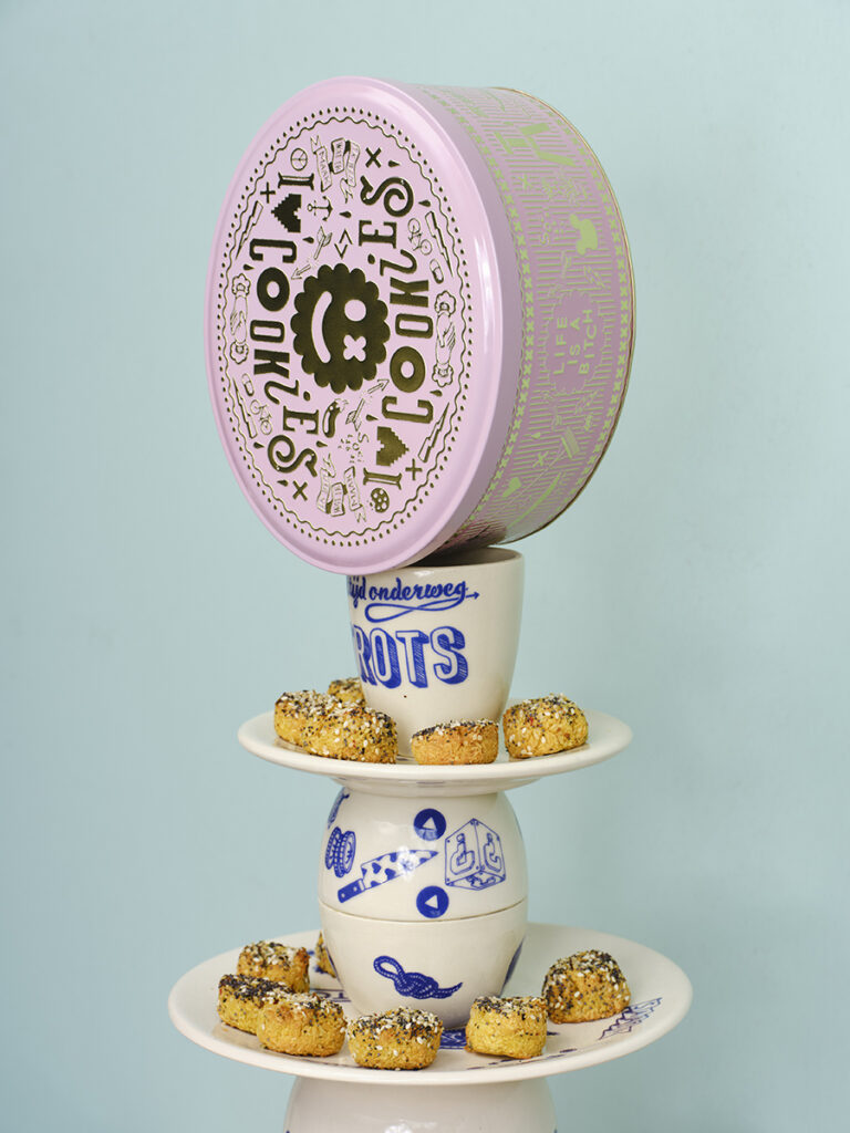 De Koekjesclub presenteert hun wereldkoekje op een installatie van verhalend servies en het nieuwe koekblik. Met nieuwe smaken en verhalen.