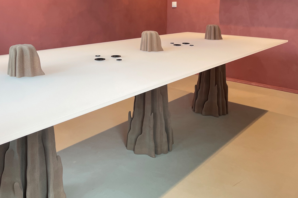Voor dit project werkte Lilian van Daal samen met biotechbedrijf Hoekmine BV, dat gespecialiseerd is in bacteriën die structurele kleur produceren. Flavobacterium IR1 organiseert zichzelf in patronen die licht reflecteren als een fotonisch kristal. Door deze bacteriën te kweken ontstaat een kleur die zowel esthetisch als ecologisch is en een duurzaam alternatief biedt voor traditionele verfprocessen.