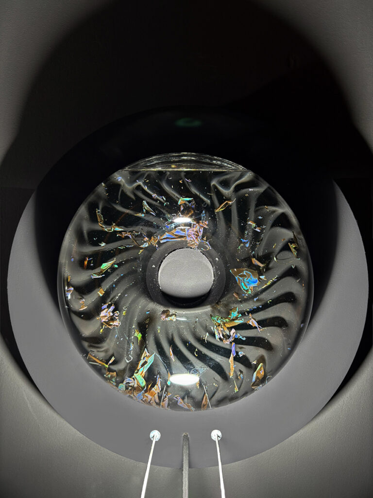 Het onderzoek resulteerde in een kinetisch object dat laat zien hoe kleur verandert door licht en beweging. Bacteriële kleurvlokken onthullen hun volledige spectrum wanneer het object beweegt. Deze dynamische ervaring laat zien hoe structurele kleur niet alleen duurzaam kan zijn, maar ook interactief en emotioneel boeiend binnen productontwerp.