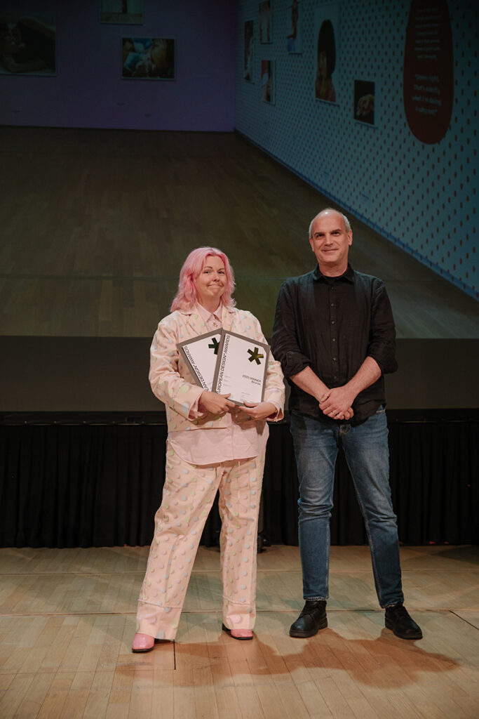 De tentoonstelling opent met een kleurrijke titel in speelse, goed leesbare typografie die perfect past bij de toon van het werk. Verspreid door de ruimte hoor je muziek van Pimo, het muzikale duo van Pixy en Moro. Als kers op de taart sluit de tentoonstelling af met twee rode bioscoopstoelen, waar je samen hun zelfgemaakte muziekvideo kunt bekijken. Een heerlijk moment van rust, liefde en humor om je bezoek mee af te ronden.