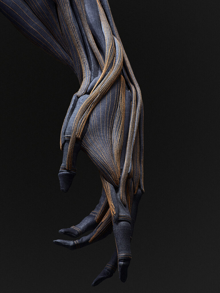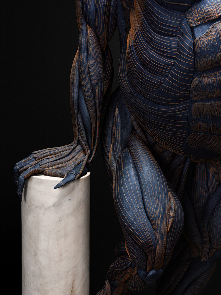 Het maken van The Denim Gorilla nam bijna twee jaar in beslag. Niet verwonderlijk, want in dit sterke staaltje vakmanschap zit 700 uur naaiwerk, 3 kilometer aan stiksels en 56 vierkante meter denim verwerkt. Dit majestueuze kunstwerk geeft een unieke inkijk in de anatomie van een gorilla. Iedere spiergroep en ader is zorgvuldig met de hand op het denim gestikt.
