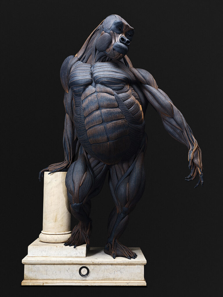 De typische dominante pose die je veel in natuurmusea tegenkomt, is losgelaten. Dit keer staat de primaat fier rechtop als een poserend model. De kunstenaars spelen met de gangbare masculiene opvattingen en het complexe gedrag van een gorilla en zijn gebruik van gereedschappen wordt uitgelicht. Tegelijkertijd is de gespierde gestalte een speelse knipoog naar de anatomische ontwerpprincipes van G-STAR. The Denim Gorilla wordt in een indrukwekkende artistieke interpretatie van de klassieke wunderkammer in het nieuwe Art Zoo Museum tentoongesteld.