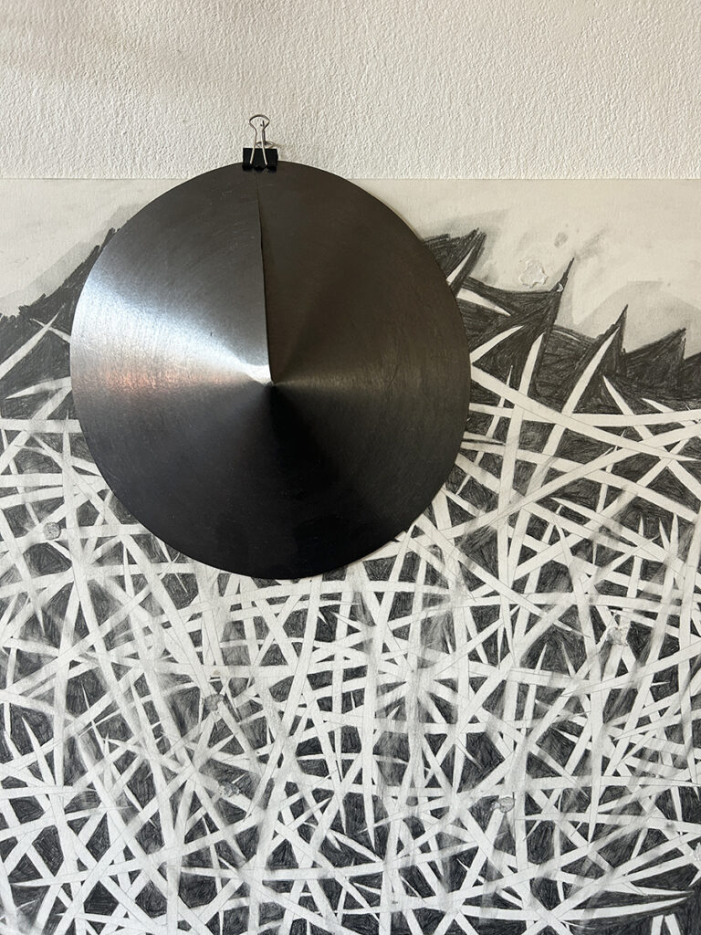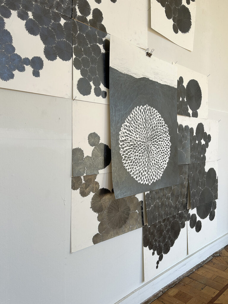 In de schetsfase komt ze al doende tot het beeld. Hier ontstaan ook haar tekeningen en sculpturen, die op zichzelf staan maar kunnen uitgroeien tot ruimte vullende installaties. Zonder vooropgezet plan, maar via een intuïtief proces. ‘Ik heb wel een idee, maar in de spontaniteit, in de creatie, in het spel, in het avontuur, daar gebeurt het’.