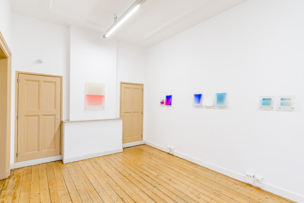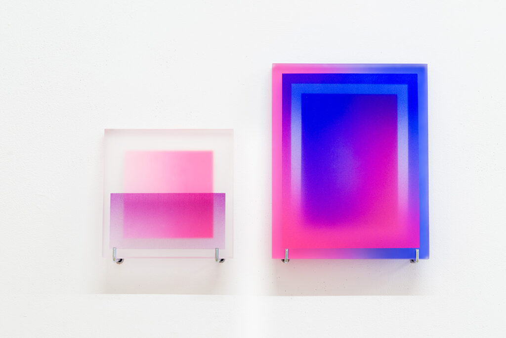 The layered compositions on transparent acrylic reveal the tension between graphic precision and organic blurring. They are experiments with geometric shapes, color gradients, soft textures, light, and space. The abstract and minimalist work is both two-dimensional and three-dimensional, creating a new spectrum. The brightly colored, intriguing objects float between image and surface.