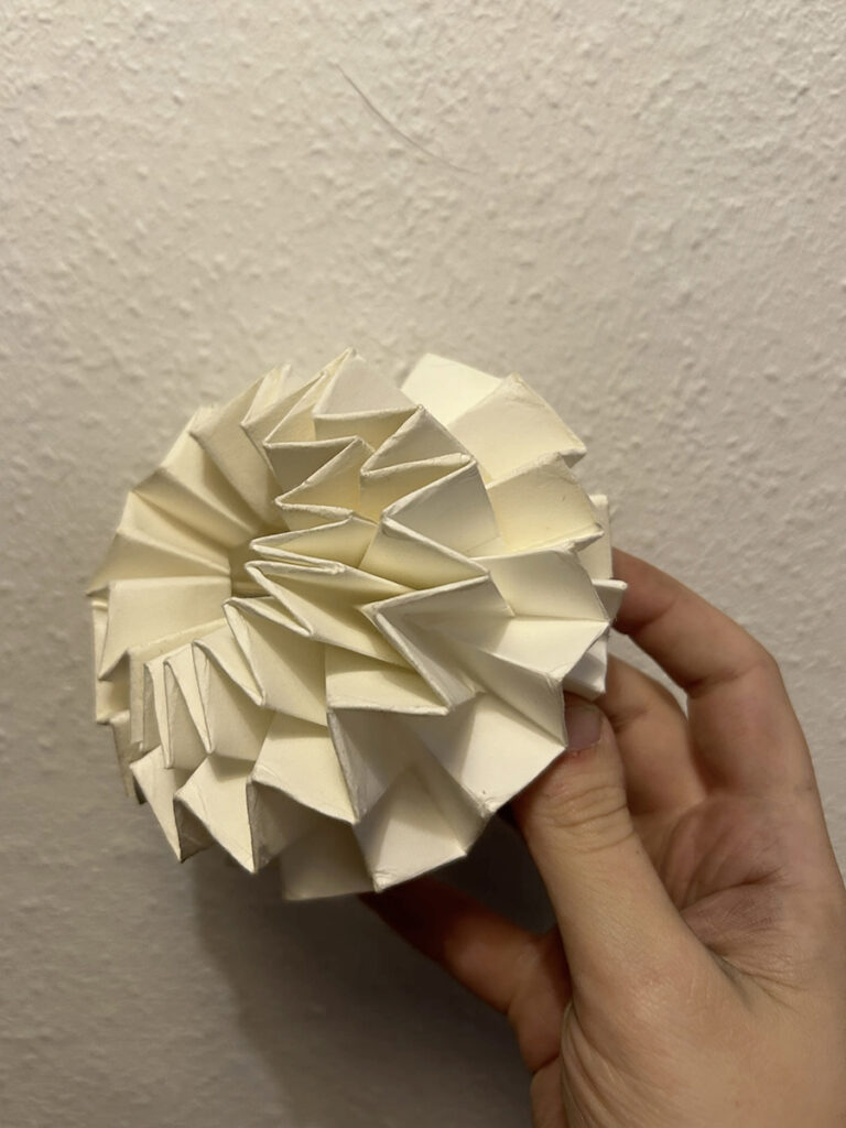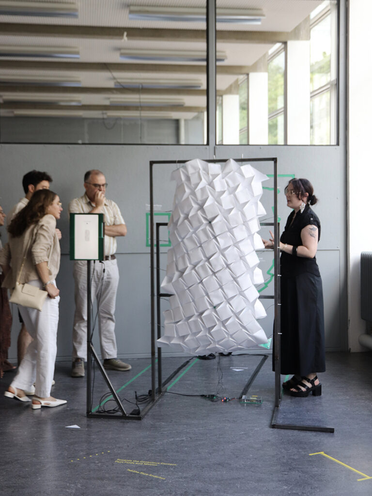 She also built in some obstacles so not everything works super smoothly. “I love friction,” she explains. “The speed of the sculpture’s breathing is influenced by the user’s interaction, for example by scrolling on a keyboard. This makes you feel responsible and you automatically become a kind of caretaker of the artwork. It confronts the user with the consequences of their actions and makes them reflect on their own phone use.” Tabitha first made scale models of randomly folded, origami-like stacks of paper, but her teacher advised her to go bigger instead. In the end, the work was finished exactly two days before the ArtEZ Finals.