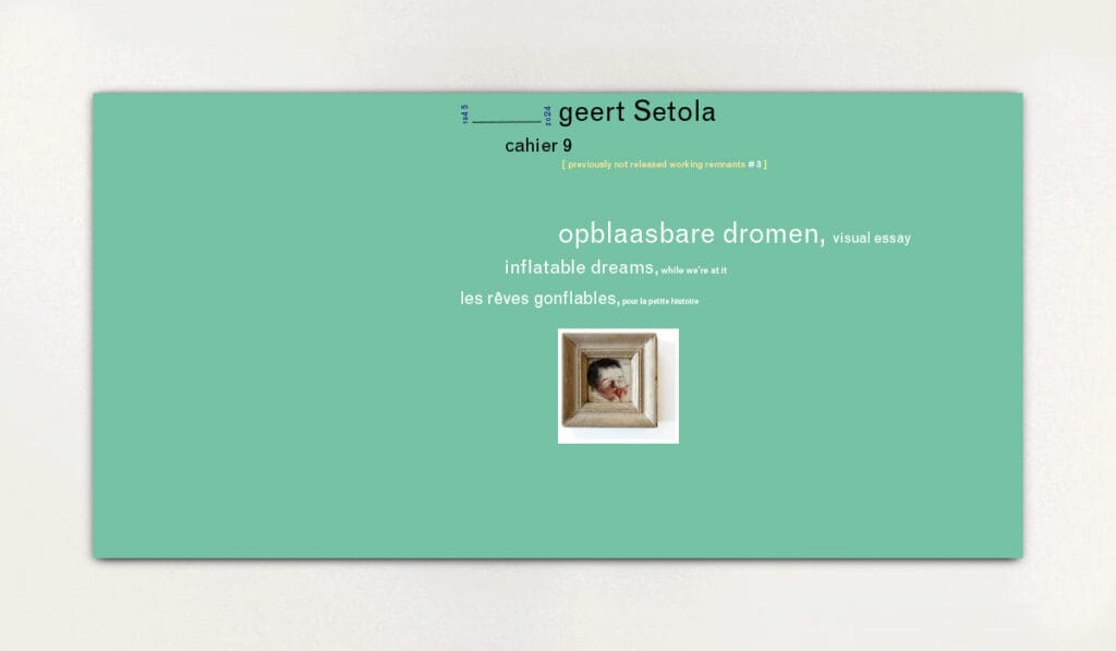 This cahier, CS-009 ‘Inflatable Dreams’, is a more or less chronological – but otherwise absolutely illogical – walk. A reflection. An investigation without a conclusion. And beyond that: years, years.