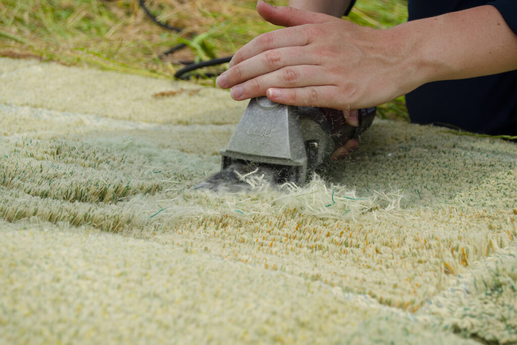 The carpet is inspired by the tones and textures of grasslands and peat. Eight natural colors evoke dry grasses, while variations in height illustrate subsidence. Cut-out sections represent agricultural loss. Scorched areas—burned during production—serve as a stark reminder of wildfires. Every thread, texture, and treatment holds meaning, reflecting how human systems shape the slow desiccation of the Dutch landscape.