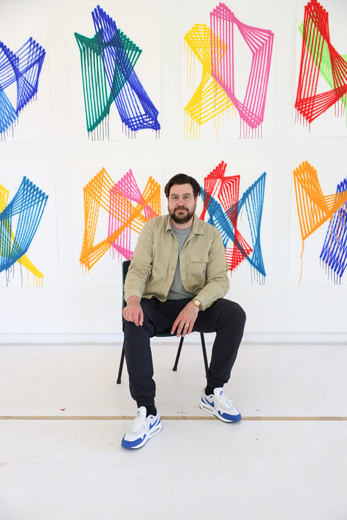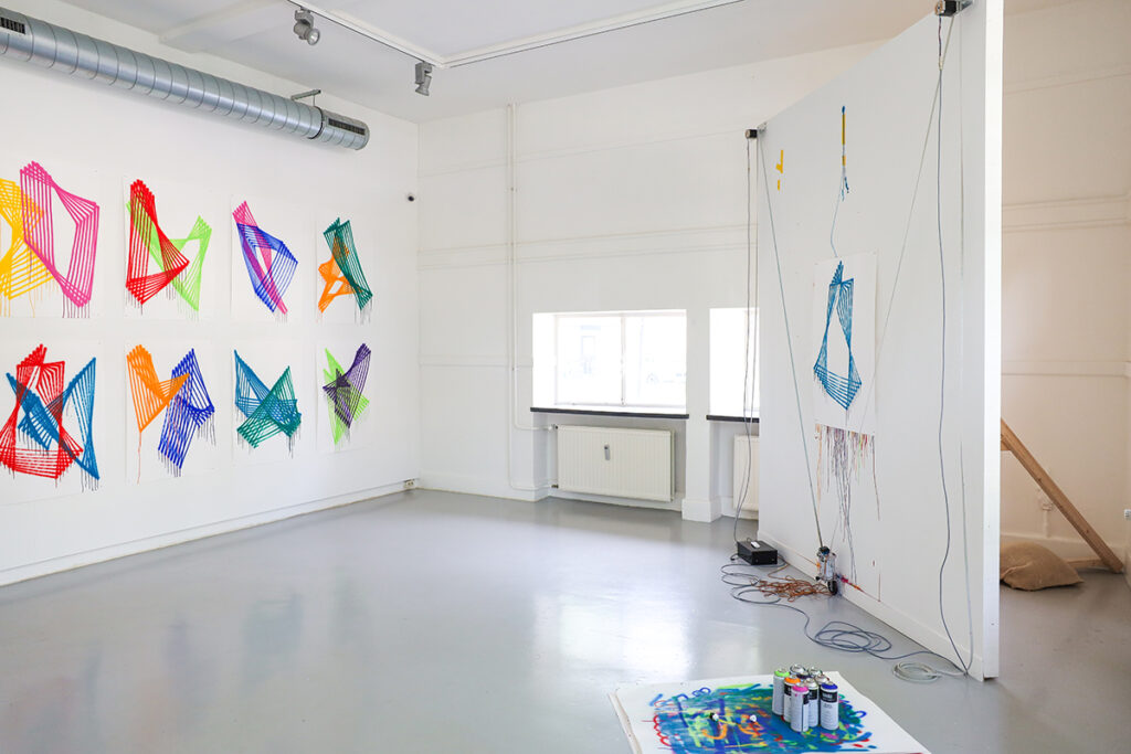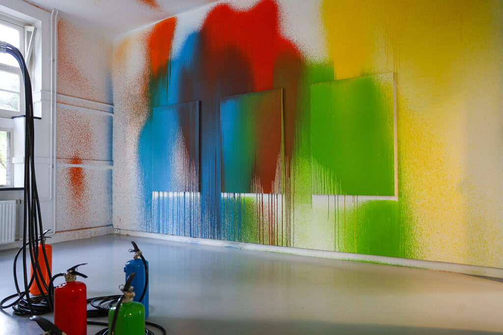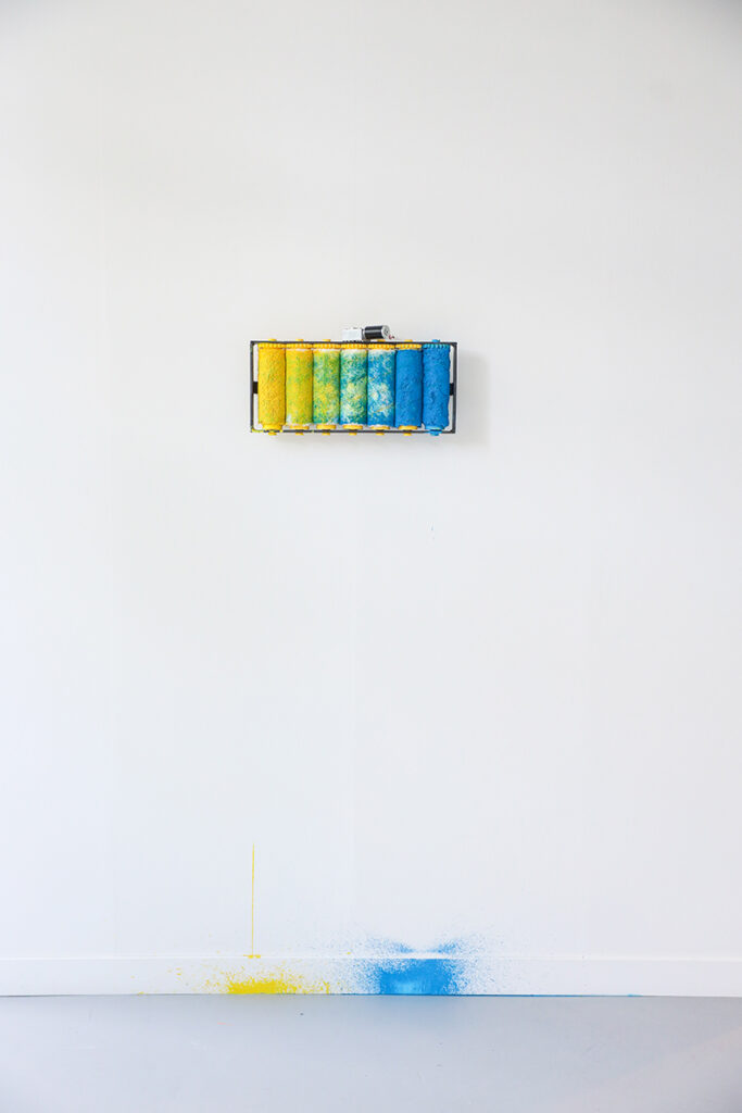 What happens when two artists fascinated by chance, movement and control join forces? Rutger de Vries and Johannes Langkamp create work that focuses on the interplay between technique and spontaneity. Take, for instance, ‘Circle Sprayers’ by Rutger: a set of five fire extinguishers filled with paint, which – via a self-designed machine – spray colourful circles on a wall. Or ‘Same Same Same’ by Johannes, where a paint roller attached to a cordless drill is briefly activated to leave paint marks on surrounding surfaces.Their work is a search for “controlled chance”, where precision meets playfulness.