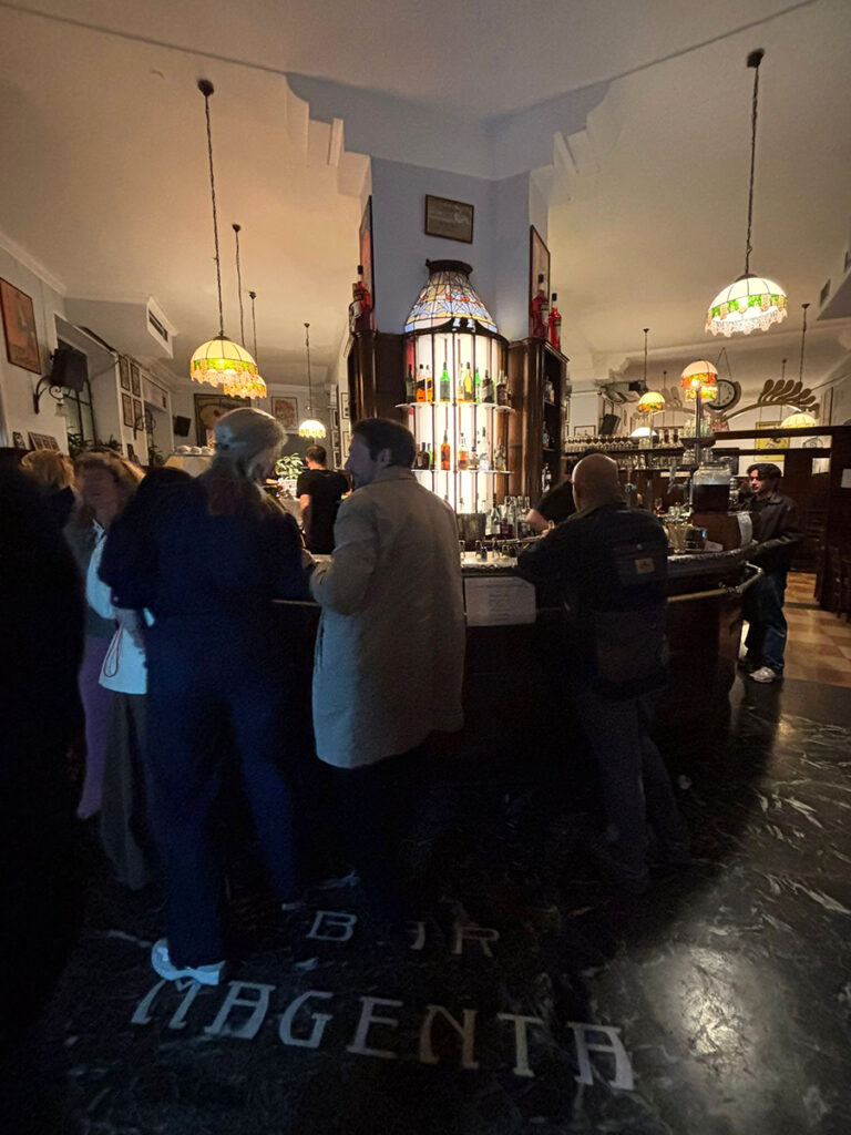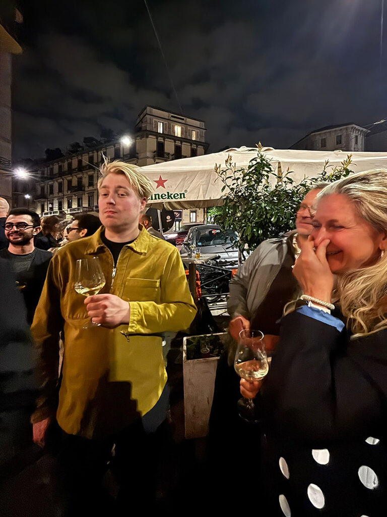 Next, on to Masterly. It’s hard to imagine a more stunning location in Milan. The reception desk in the lobby gets a little bigger every year. No matter how beautiful the brands showcasing their work here are, designers with unique ideas are becoming increasingly rare. A beautiful cabinet by Erik Sloot, stunning enameled steel tables by Bart Stok, and the unique circular concept of the Infinity chair by NO-EM—a chair built to last and always eligible for buyback by the manufacturer—designed by Robert Bronwasser. Carina Riezenbos, art director at Blok Plaatmateriaal, has been setting up the booth on the veranda of this beautiful palazzo for years—a dream job in many ways. Masterly is getting ready for tonight’s drinks party hosted by De Interieur Club. Afterward, we’re heading to Bar Magenta for Anne’s birthday; if you’re not there, you haven’t been to Milan—see you tonight!