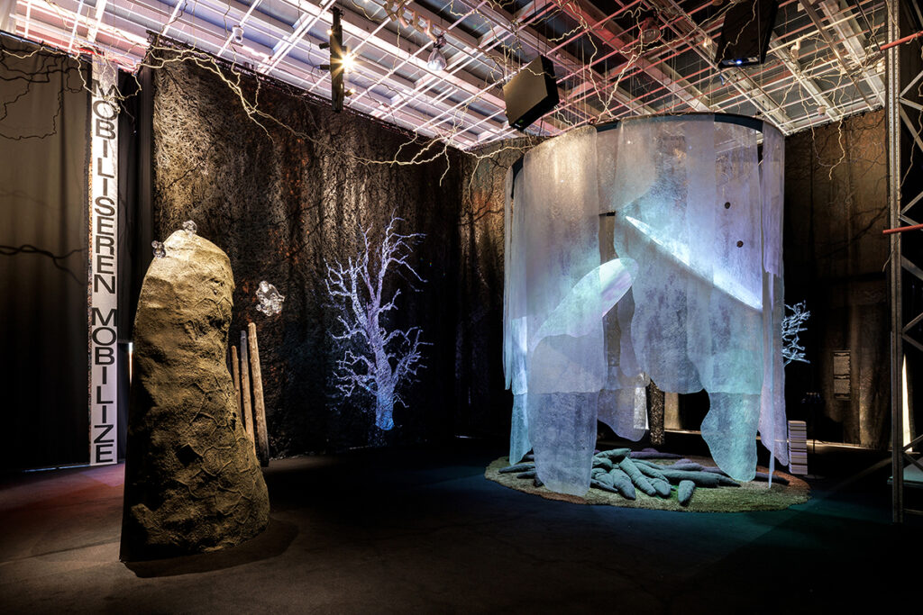 The third room, Mobilize, takes a more optimistic approach, demonstrating how fungi can coexist with human and non-human life, from termite mounds and elephant dung to the human digestive tract and architecture. This is evident in the installation Architecture must rot (Chair for Biohybrid Architecture, 2025), in which architect Phil Ayres allows fungi to take the lead in ecological design. It also demonstrates how fungi live on the trees in the adjacent New Garden to support its zoöp, the museum’s governance model that takes non-human life into account.