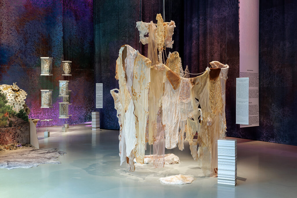 At the heart of FUNGI are seven new pieces of art created specifically for the exhibition. These are the result of collaborations between artists and scientists. The artists have reinterpreted existing scientific research and translated it into paintings, sculptures and multimedia installations. These works showcase fungi as independent designers, allies, and world builders. In addition, also on display are four commissioned individual works, and several loans by artists including Lizan Freijsen, Olafur Eliasson and Annicka Yi.