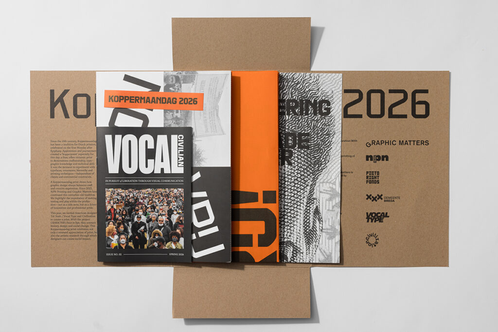 Since 2023, Graphic Matters and NPN Drukkers have continued this tradition with a contemporary interpretation. In 2026, for the third time, they present a new Koppermaandagprent, underlining the importance of creation, testing and research in graphic design. For this edition, they invited American designer Tré Seals (Vocal Type Co.) and studio Civilisation.