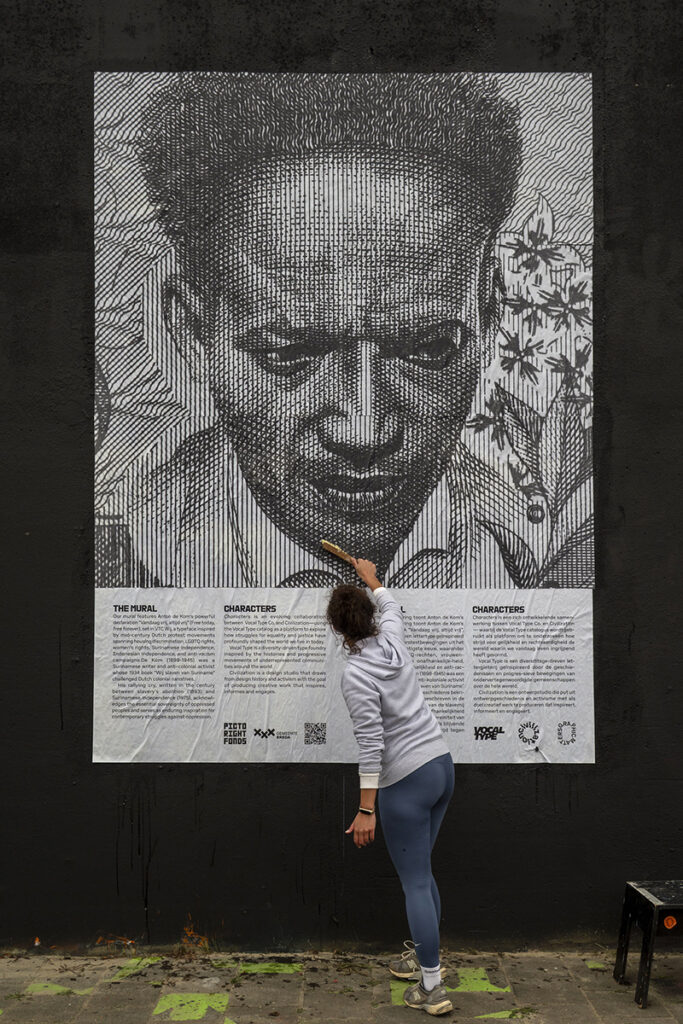 The Koppermaandagprent 2026 is linked to the CHARACTERS: Voices in Type project, which brings together history, design and social change. It is inspired by the protest for the rehabilitation of Surinamese writer, resistance fighter and anti-colonial activist Anton de Kom. Tré Seals designed the VTC WIJ typeface especially for this project, based on Dutch post-war protest banners and action typography. This typeface gives De Kom’s message of resistance, solidarity and freedom a contemporary and visible form.