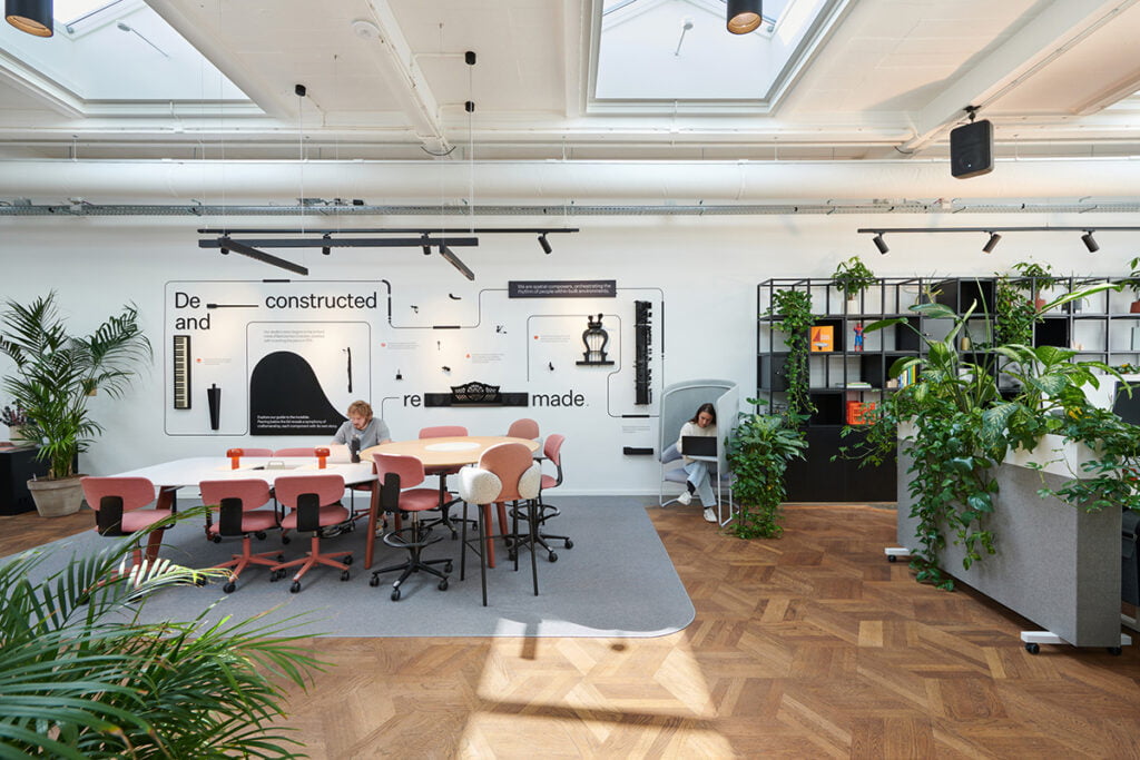 The brand experience team added bespoke art, objects, signage and installations. An interactive site with QR codes allows guests to learn about the living lab. In the centre of the studio sits a deconstructed piano installation made with parts donated by a local piano workshop.