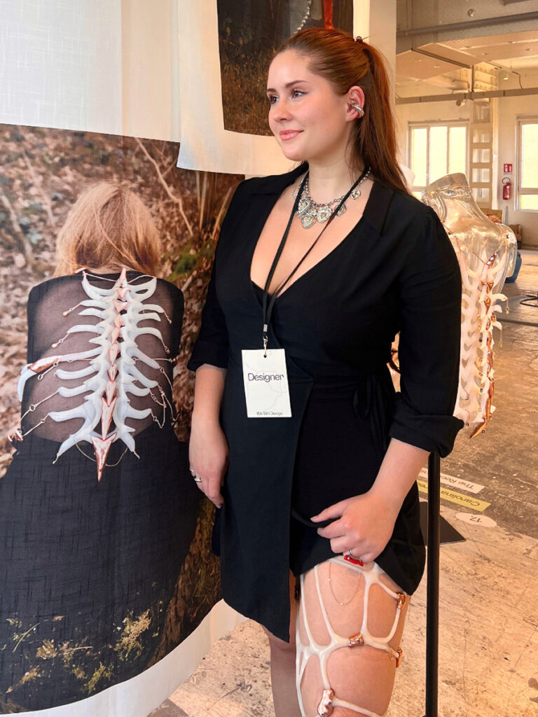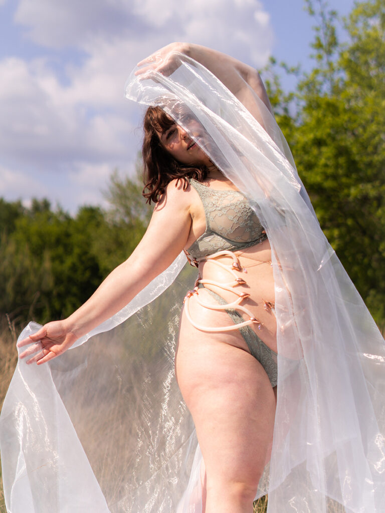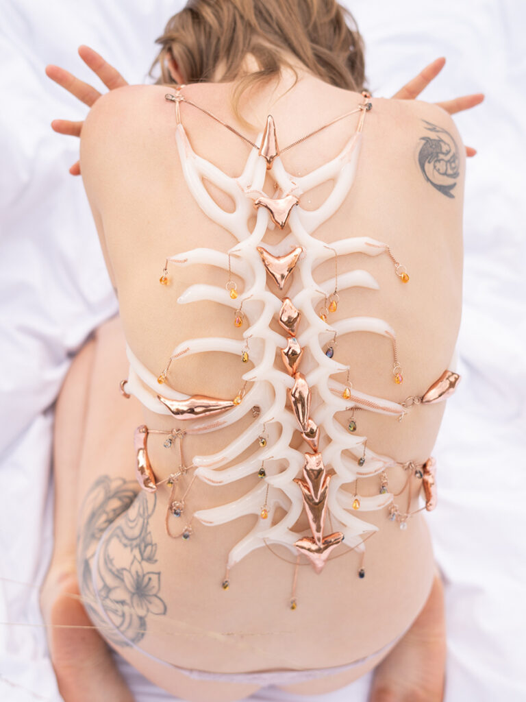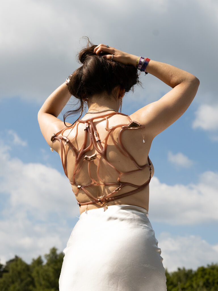At its core is a jewelry collection that challenges conventional norms of femininity. Each piece highlights areas often labeled as “imperfections”—the belly, back, thighs, breasts—and reframes them as sites of power. These are not accessories designed to flatter, but sculptural tools for reclamation: to question what beauty is, examine its impact, and honor the body as it is. Made from silicone and copper, the pieces intentionally distort the form of the body part they represent—disrupting our perception and inviting reflection on how we see ourselves. Silicone, being soft and flexible, molds to the body’s natural curves, enhancing the intimate relationship between the jewelry and the wearer. In doing so, the pieces offer a tactile exploration of shame, strength, and self-acceptance.