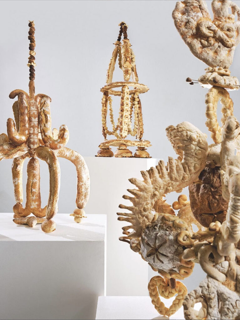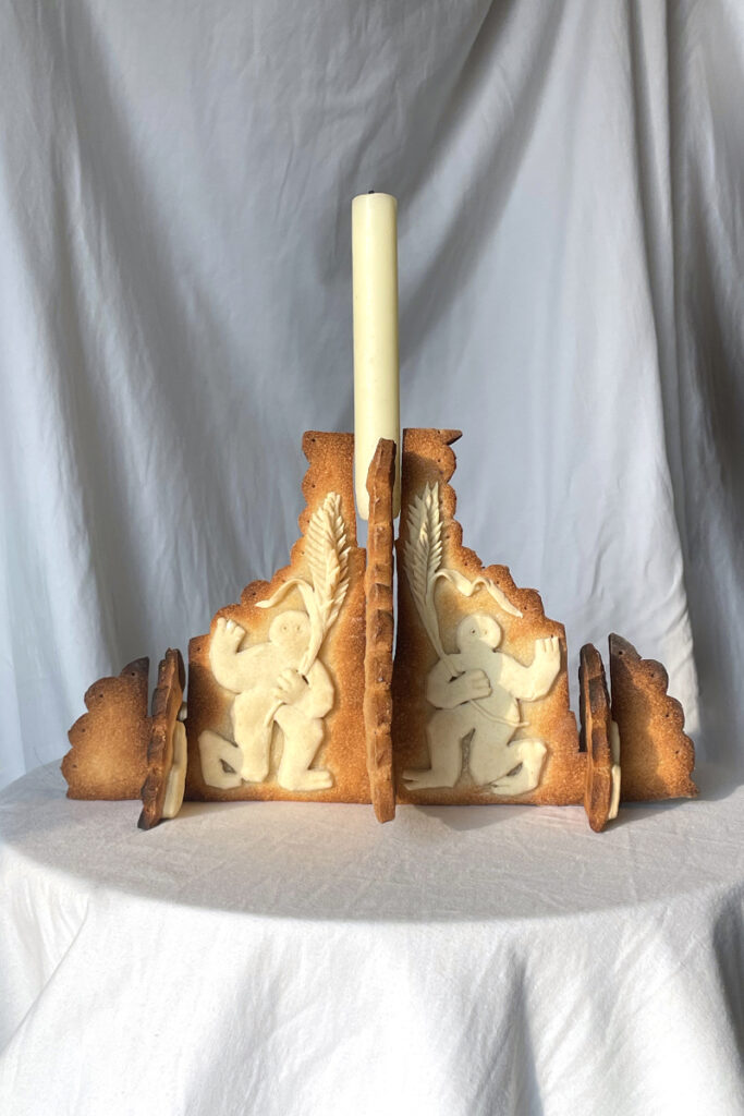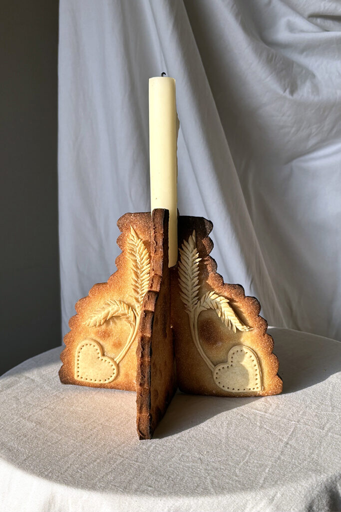 At the heart of their work lies a deep fascination with bread—particularly sourdough—as a medium of expression. Their latest project, Croûte que Croûte, transforms bread into an artistic statement. This collection of chandeliers and vases elevates bread beyond its everyday role, turning it into a symbol of care, heritage, and connection. The objects bear intricate symbols reflecting themes of tradition, agriculture, and friendship—reminding us of bread’s place as a universal staple.