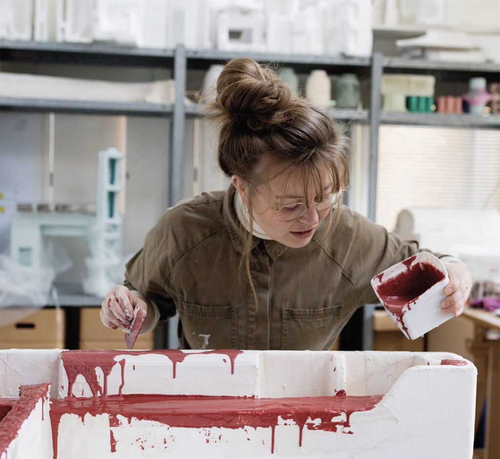 Her creativity is fuelled by the inherent qualities of existing shapes, textures, and techniques, pushing her to explore how these elements can be reimagined in a new context. She finds similar inspiration in architecture and natural structures, grounding her practice in both material and visual memory.
