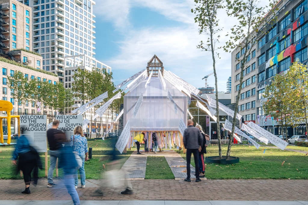 The Pigeon Dialogues is a project by Nikki Gonnissen (Thonik), Maurice Boyer and Studio Corvers. For the installation, she addresses the strong separation between city and countryside, aiming to build a bridge that brings together the many different perspectives. Inspired by pigeon post and the historic pigeon lofts you still occasionally come across in the countryside, the design creates a safe space to exchange ideas and facilitate discussion.