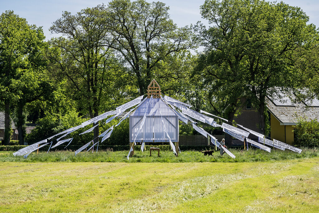 First on show as a part of the design festival Wiede Wold, in Echten, in the province of Drenthe, the installation has been designed to look like a pigeon loft – a metaphor for slow, nuanced communication. Carrier pigeons can find their way home over hundreds of kilometers and only carry one message at a time. The current social polarisation is partly fuelled by the speed of social media, where context is lacking and information not consciously considered. As a result, people talk past each other, and there is no room for dialogue. Only if we choose to take longer and actively think and listen to each other, can we arrive at a meaningful conversation. What is really needed to achieve a sustainable future for future generations?