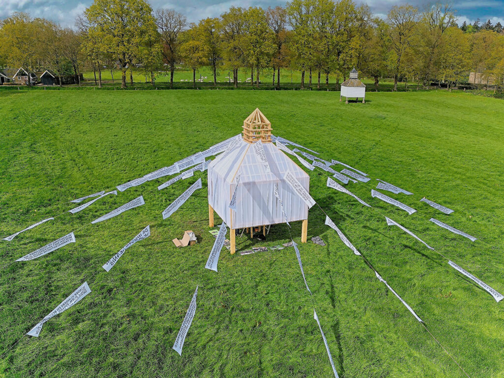 Visitors are invited to leave their own message for the future by writing it on colourful ribbons and tying it to the installation. The Pigeon Dialogues thus becomes a temple where many opinions come together.