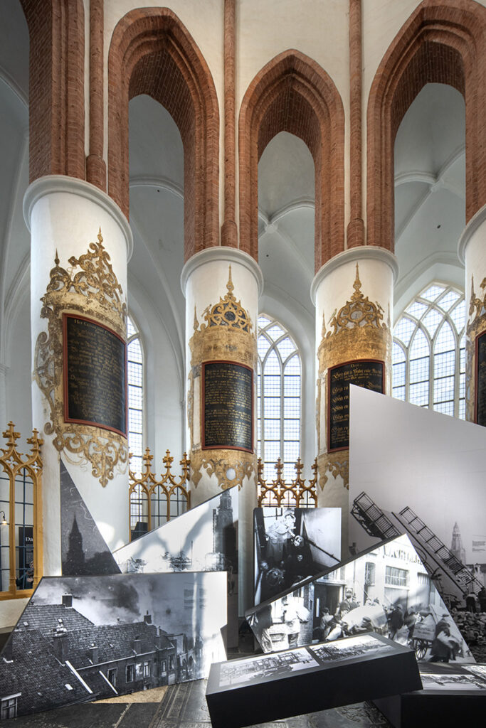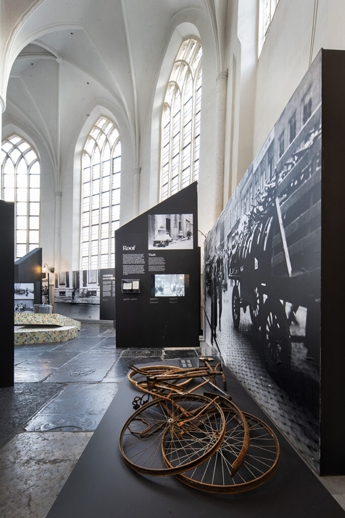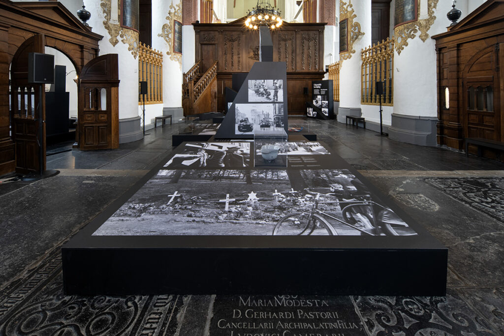 Curator Martin Hillenga, known for the book 40/45, curated the exhibition. The design of the exhibition houses a ruined skyline of Groningen in the Akerk. These ruins conceal original objects from the period ’40 – ’45. Walking through the Akerk, the Second World War comes to life in and around the Akerk. War Close By.